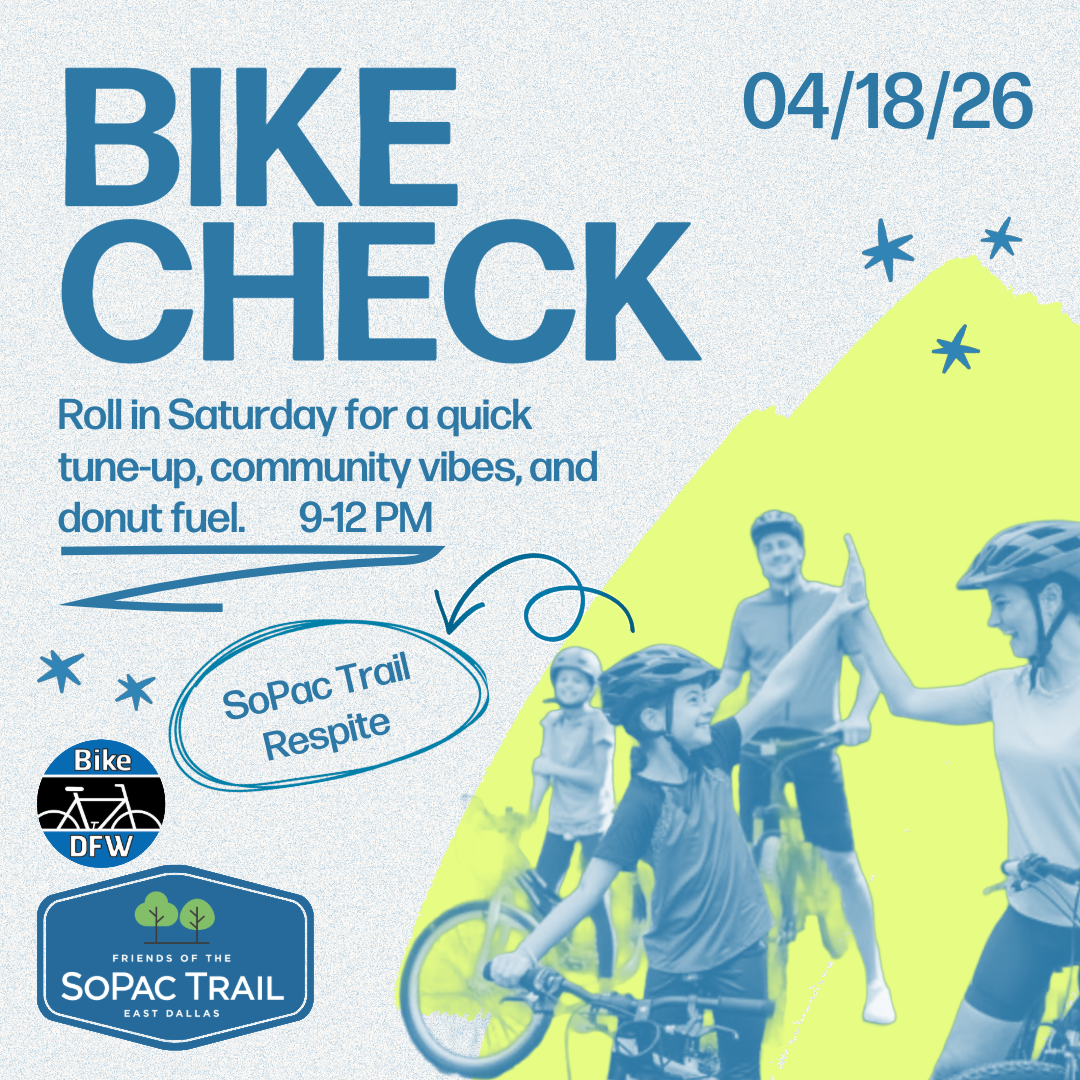 This Saturday, April 18, from 9:00 AM to 12:00 PM, we are partnering with Bike DFW to offer a free bicycle tune-up and safety check at the SoPac Respite area, located between the trail and Fisher Road.